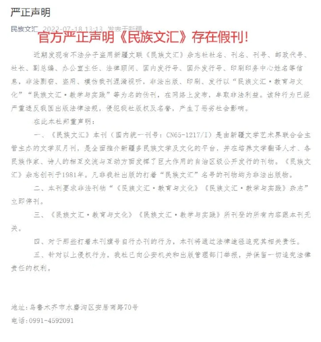《民族文汇》杂志社官方早2022年7月18日发布严正声明:声明如图。