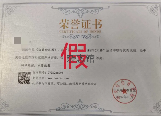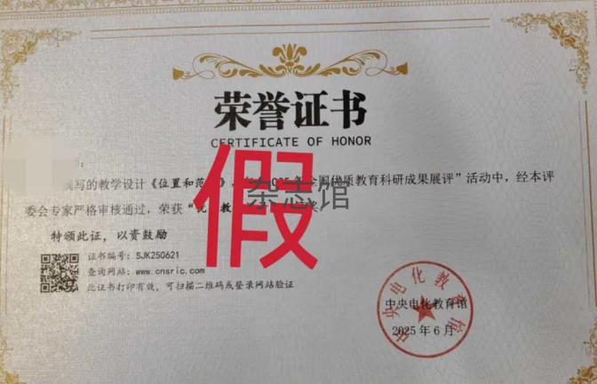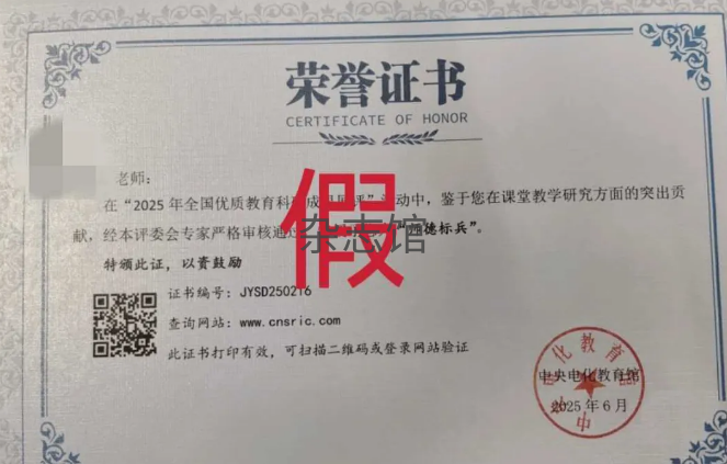 我中心从未举办“2025年全国优质教育科研成果展评”“全国教师优质课评比大赛”等上述虚假证书对应的活动,未颁发过此类虚假荣誉证书。请广大教育工作者、社会公众提高警惕,避免财产损失与权益受损。