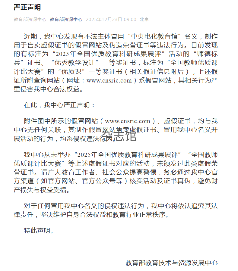 声明如下:有不法主体冒用“中央电化教育馆”名义,制作用于售卖虚假证书的假冒网站及伪造荣誉证书等违法行为。目前发现的有标注为“2025年全国优质教育科研成果展评”活动的“师德标兵”证书、“优秀教学设计”一等奖证书,标注为“全国教师优质课评比大赛”的“优质课”一等奖证书